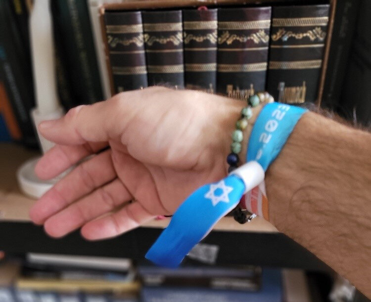 Az élénk, szinte vidám színek senkit se tévesszenek meg: ezek azokra a karszalagokra utalnak, amelyeket a Hamász terroristái által meggyilkolt fesztiválozók viseltek. A karszalagon a 2023. október 7-i dátum látható egy Dávid-pajzs mellett, s egy héber nyelvű felirat, amely a túszokra utalva magyarul így hangzik: „Amíg ők ott vannak, mi is ott vagyunk velük”.
