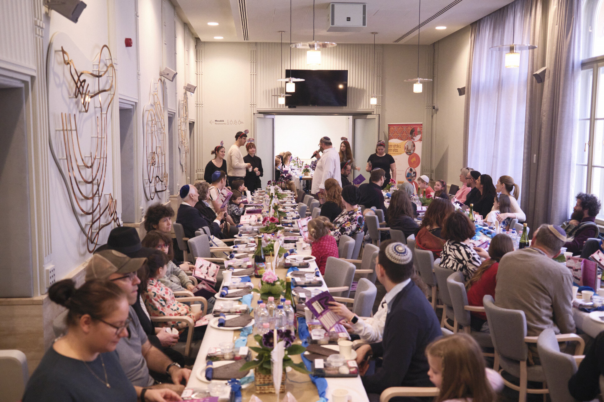 A pészáhi tanszéderre hamar megtelt a Rumbach zsinagóga kávézója. A résztvevő családok és gyerekek között sokaknak első zsinagógai látogatásuk volt ez a különleges alkalom, ahol belépve a helyszínre máris elvarázsolta őket a varázslatos, ünnepi dekoráció. A színes virágcsokrokat maceszlapok fogták körül, az asztalon álló papírpiramisok, kagylók ötletes módon elevenítették fel e a vörös tenger kettéválasztásának történetét. Minden apróság esztétikusan idomult a pészáh ünnepéhez.