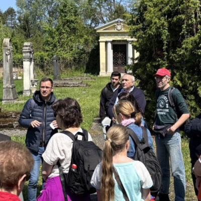 Ezután várostörténeti séta következett: a hallgatók felkeresték Fejtő Ferenc szülőházát, megtekintették az egykori zsidó elemi és felső kereskedelmi iskolát – az egyetlen ilyet az országban –, és végigjárták a főtér azon épületeit is, ahol egykor a város prominens zsidó családjai éltek.