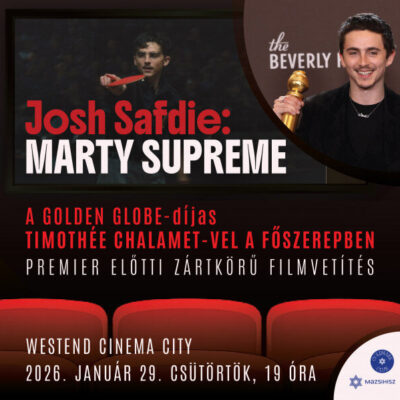Szeretettel meghívjuk a Röhrig Géza és munkatársai által fémjelzett Mazsihisz–Goldmark Club első estjére. Az eseményen Josh Safdie amerikai rendező, kilenc kategóriában Oscar-díjra jelöt Marty Supreme című filmjét – a friss Golden Globe-díjas Timothée Chalamet főszereplésével – az országos premier előtt egy héttel, ingyenes, zártkörű vetítés keretében láthatják a Westend Cinema Cityben 2026. január 29-én, csütörtökön este 7 órakor. A részvétel ingyenes, de csak érvényes regisztrációval látogatható.