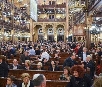 Ritka jelenség a Dohány utcai zsinagógában, hogy a földszintet és a karzatot a középgeneráció tagjai töltik meg.