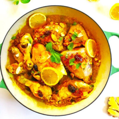 8. Öntsd bele a citromlét, szórd meg mazsolával és mandulával. Ha kell, pótold a levét. Párold, amíg a hús teljesen meg nem puhul.