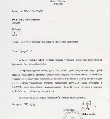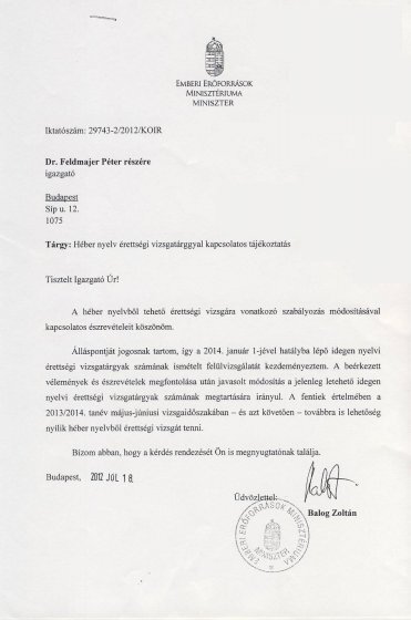 Balog Zoltán az Emberi Erőforrások Minisztériumának minisztere levélben tájékoztatta dr. Feldmájer Pétert a Magyarországi Zsidó Hitközségek Szövetsége elnökét arról, hogy továbbra is lehetőség nyílik héber nyelvből érettségizni.