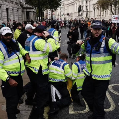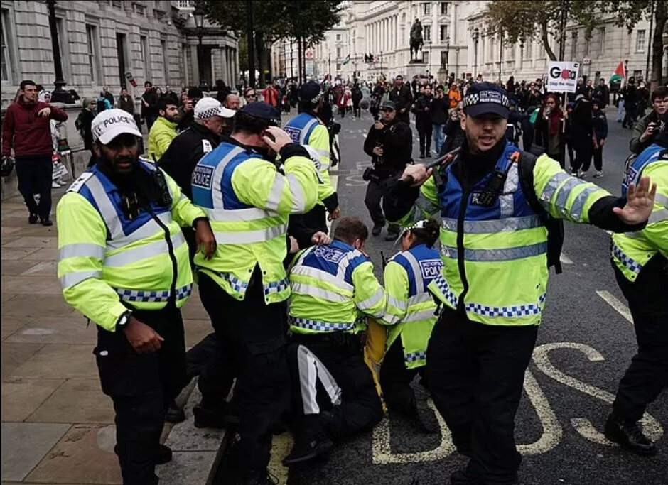 (Címlapkép: Londonban elfognak egy tüntetőt, aki fejbe dobott egy rendőrt. Fotó: Dailymail.co.uk)