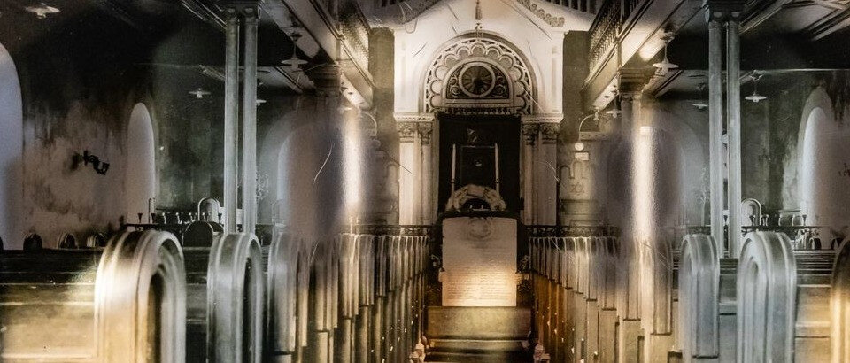 a0be7a9892ef4919b06a011e60367dc8.jpgA bejáratnál kiállított kép történelmi felvétele emlékezteti a látogatókat a tatai zsinagóga egykori szépségére. Fotó: Wierl Ádám