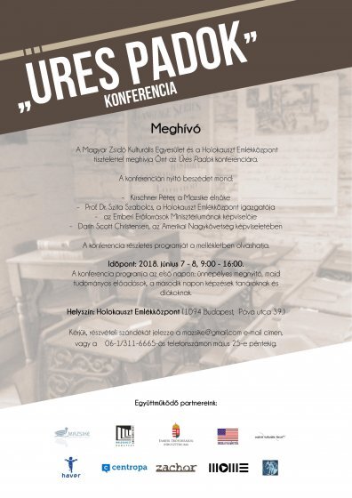 A Magyar Zsidó Kulturális Egyesület és a Holokauszt Emlékközpont tisztelettel meghívja Önt az Üres Padok című két napos konferenciára. A Konferencia időpontja: 2018. június 7-8., helyszíne a Holokauszt Dokumentációs Központ (Budapest IX. ker., Páva u. 39.)