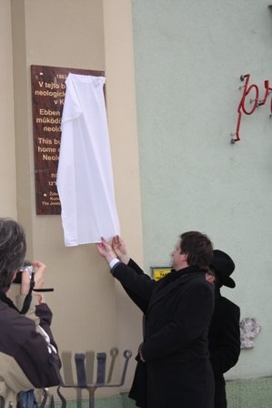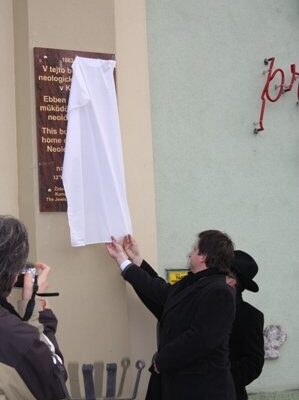 A megemlékezés keretében emléktáblát avattunk az 1863-ban épült egykori neológ zsinagóga falán, mely 1944-ig szolgálta híveit. Az épület a második világháború során megrongálódott, a hazatérő maroknyi túlélő többé már nem tudta eredeti céljára használni a Király püspök és Hajnal (ma Štúr) utca sarkán álló imaházat. Az újjáalakult, anyagi gondokkal küzdő hitközség 1950-ben adta el az épületet azzal a kitétellel, hogy arról minden olyan jelképet távolítsanak el, amely szakrális jellegére utal. Az első világháborús emlékművet és a zsinagóga tetejét díszítő két kőtáblát a helyi zsidó temető ravatalozójában helyezték el.