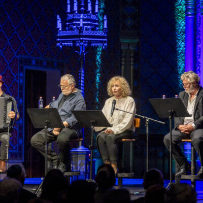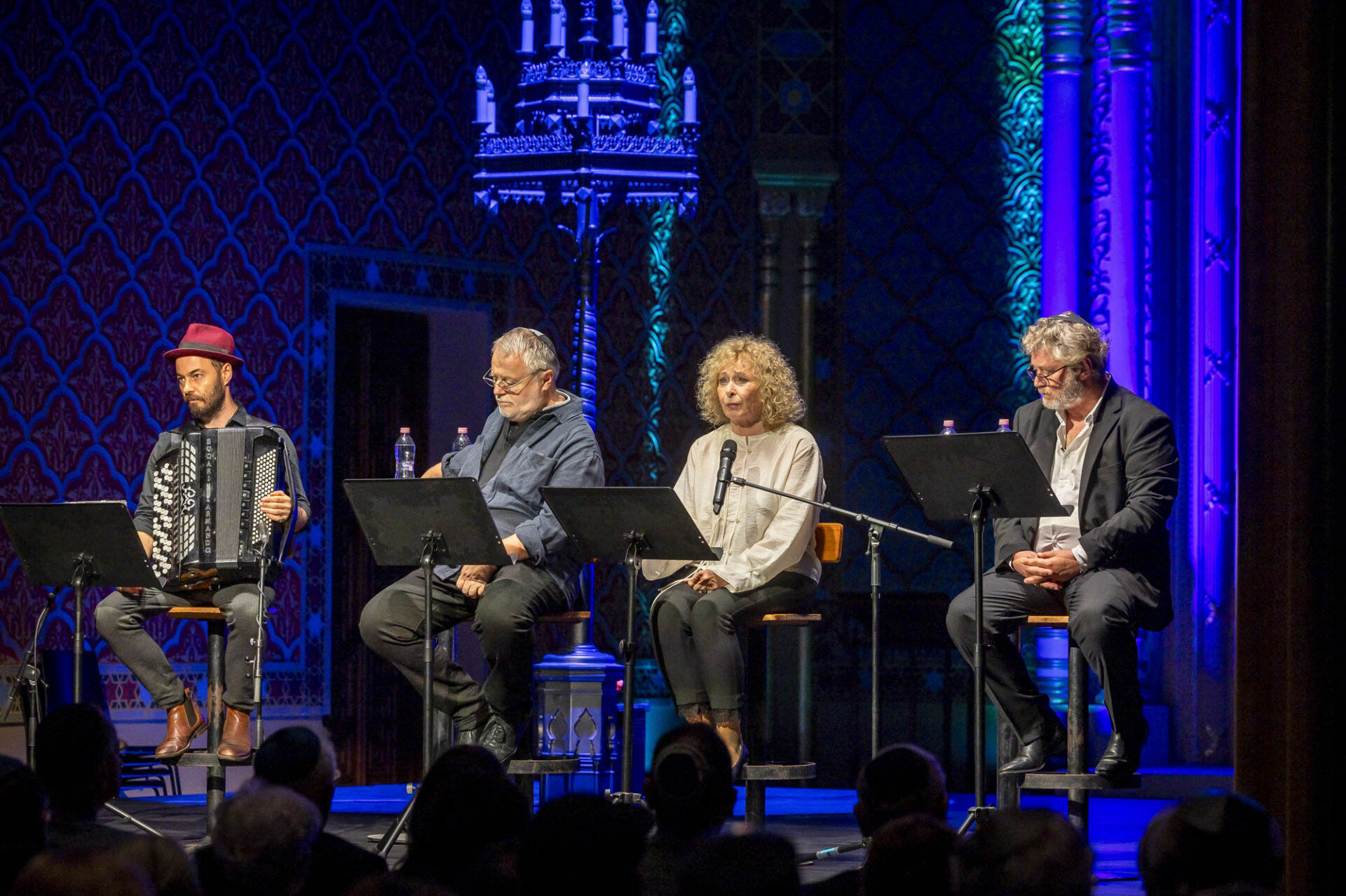 Az irodalmi anyag viszonylag rövid, de fájdalmasan sűrű időszakon ívelt végig, maga Máté Gábor, továbbá Bánsági Ildikó és Görög László megszólalásaival meg Móser Ádám harmonikajátékával – ez utóbbira még külön szándékozom kitérni. Ívet mondtam, de ez a deportálásoktól a megsemmisítő táborok felszabadításáig tartó történet számos olyan kitérőt is tartalmazott, amelyek szinte végtelen horizonttá változtatták a Rumbach zsinagóga színpadára állított műveket – úgyhogy Máté Gábor már csak ennek a sokféleségnek a kiválogatásáért és egybeszerkesztéséért is valamiféle irodalmi-szerkesztői díjat érdemelne…