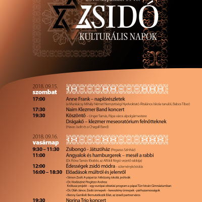 A Pápa és Környéke Zsidó Kulturális Hagyományőrző Egyesület, 2018. szeptember 15-16. között Zsidó Kulturális Napokat szervez a város zsinagógájában. A szervezők koncertekkel, előadások múltról és jelenről, zsidó ízek kóstolójával, játszóházzal és Dr. Róna Tamás főrabbi meséivel várják az érdeklődőket.