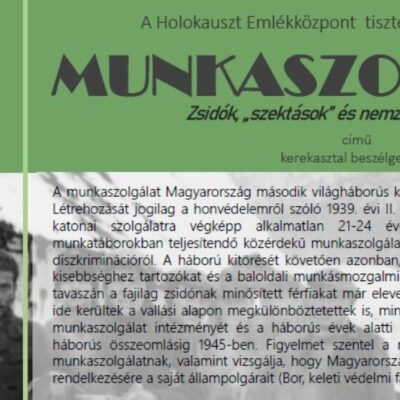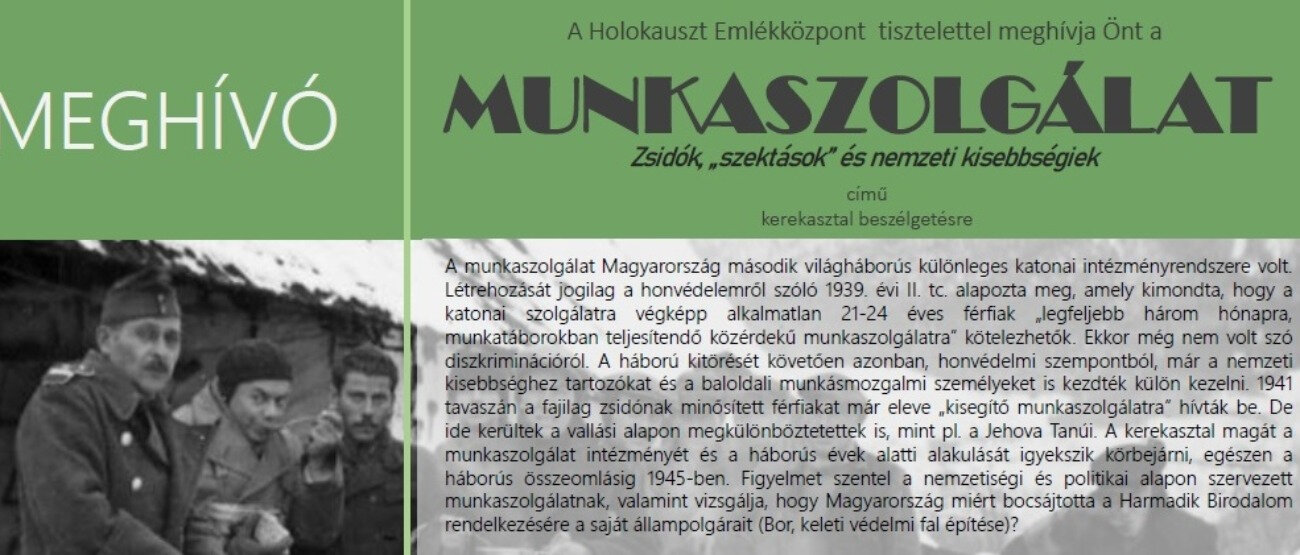 A Holokauszt Emlékközpont tisztelettel meghívja Önt a munkaszolgálat Zsidók, „szektások” és nemzeti kisebbségiek című kerekasztal beszélgetésre, 2020. október 8. (csütörtök) este 6 órára. A programhoz Zoom alkalmazáson keresztül csatlakozhat vagy a Holokauszt Emlékközpont Facebook oldalán élőben követheti az előadást. További információ és regisztráció: a regisztracio@hdke.hu e-mail címen.